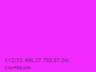XYZ 55.496,27.753,97.04 Color is a normal magenta color and the nearest color is Magenta / Fuchsia #ff00ff. Hex code #f22aff and RGB value is rgb(242,42,255). In RGB color space, this color is composed of 95% red, 16% green, 100% blue, In CMYK color space, this color is composed of 5% cyan, 84% magenta, 0% yellow , 0% black , In HSL color space, this color has a hue angle of 296° , 100% saturation and 58% lightness.