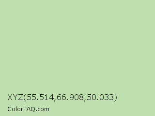 XYZ 55.514,66.908,50.033 Color is a light green color and the nearest color is Sprout #c1d7b0. Hex code #bfdfae and RGB value is rgb(191,223,174). In RGB color space, this color is composed of 75% red, 87% green, 68% blue, In CMYK color space, this color is composed of 14% cyan, 0% magenta, 22% yellow , 13% black , In HSL color space, this color has a hue angle of 99° , 43% saturation and 78% lightness.