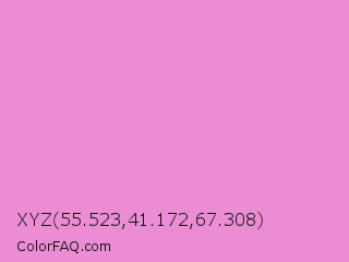 XYZ 55.523,41.172,67.308 Color is a light magenta color and the nearest color is Light Orchid #e29cd2. Hex code #eb8cd4 and RGB value is rgb(235,140,212). In RGB color space, this color is composed of 92% red, 55% green, 83% blue, In CMYK color space, this color is composed of 0% cyan, 40% magenta, 10% yellow , 8% black , In HSL color space, this color has a hue angle of 315° , 70% saturation and 74% lightness.