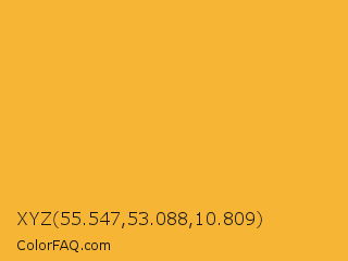 XYZ 55.547,53.088,10.809 Color is a normal orange color and the nearest color is Tulip Tree #eab33b. Hex code #f7b536 and RGB value is rgb(247,181,54). In RGB color space, this color is composed of 97% red, 71% green, 21% blue, In CMYK color space, this color is composed of 0% cyan, 27% magenta, 78% yellow , 3% black , In HSL color space, this color has a hue angle of 39° , 92% saturation and 59% lightness.