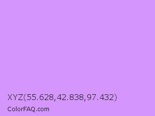 XYZ 55.628,42.838,97.432 Color is a light purple color and the nearest color is Pale Violet #cc99ff. Hex code #d496fc and RGB value is rgb(212,150,252). In RGB color space, this color is composed of 83% red, 59% green, 99% blue, In CMYK color space, this color is composed of 16% cyan, 40% magenta, 0% yellow , 1% black , In HSL color space, this color has a hue angle of 276° , 94% saturation and 79% lightness.