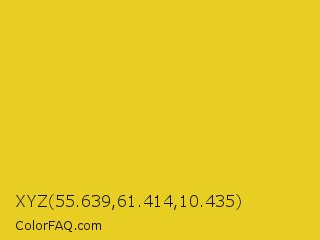 XYZ 55.639,61.414,10.435 Color is a normal yellow color and the nearest color is Sunflower #e4d422. Hex code #e8ce22 and RGB value is rgb(232,206,34). In RGB color space, this color is composed of 91% red, 81% green, 13% blue, In CMYK color space, this color is composed of 0% cyan, 11% magenta, 85% yellow , 9% black , In HSL color space, this color has a hue angle of 52° , 81% saturation and 52% lightness.