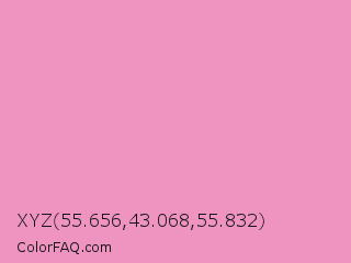 XYZ 55.656,43.068,55.832 Color is a light rose color and the nearest color is Pastel Magenta #f49ac2. Hex code #ef93c1 and RGB value is rgb(239,147,193). In RGB color space, this color is composed of 94% red, 58% green, 76% blue, In CMYK color space, this color is composed of 0% cyan, 38% magenta, 19% yellow , 6% black , In HSL color space, this color has a hue angle of 330° , 74% saturation and 76% lightness.