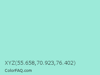 XYZ 55.658,70.923,76.402 Color is a light cyan color and the nearest color is Water Leaf #a1e9de. Hex code #9cead9 and RGB value is rgb(156,234,217). In RGB color space, this color is composed of 61% red, 92% green, 85% blue, In CMYK color space, this color is composed of 33% cyan, 0% magenta, 7% yellow , 8% black , In HSL color space, this color has a hue angle of 167° , 65% saturation and 76% lightness.