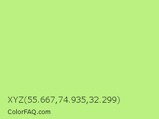 XYZ 55.667,74.935,32.299 Color is a light green color and the nearest color is Sulu #c1f07c. Hex code #baf181 and RGB value is rgb(186,241,129). In RGB color space, this color is composed of 73% red, 95% green, 51% blue, In CMYK color space, this color is composed of 23% cyan, 0% magenta, 46% yellow , 5% black , In HSL color space, this color has a hue angle of 89° , 80% saturation and 73% lightness.
