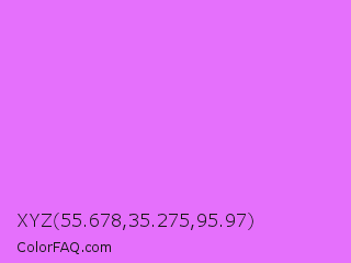XYZ 55.678,35.275,95.97 Color is a light purple color and the nearest color is Heliotrope #df73ff. Hex code #e570fc and RGB value is rgb(229,112,252). In RGB color space, this color is composed of 90% red, 44% green, 99% blue, In CMYK color space, this color is composed of 9% cyan, 56% magenta, 0% yellow , 1% black , In HSL color space, this color has a hue angle of 290° , 96% saturation and 71% lightness.