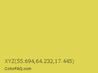 XYZ 55.694,64.232,17.445 Color is a normal yellow color and the nearest color is Wattle #dcd747. Hex code #ded652 and RGB value is rgb(222,214,82). In RGB color space, this color is composed of 87% red, 84% green, 32% blue, In CMYK color space, this color is composed of 0% cyan, 4% magenta, 63% yellow , 13% black , In HSL color space, this color has a hue angle of 57° , 68% saturation and 60% lightness.