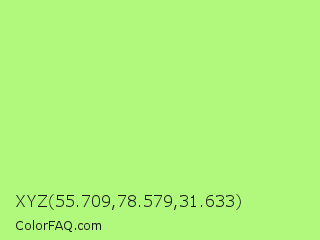 XYZ 55.709,78.579,31.633 Color is a light green color and the nearest color is Sulu #c1f07c. Hex code #b1f97d and RGB value is rgb(177,249,125). In RGB color space, this color is composed of 69% red, 98% green, 49% blue, In CMYK color space, this color is composed of 29% cyan, 0% magenta, 50% yellow , 2% black , In HSL color space, this color has a hue angle of 95° , 91% saturation and 73% lightness.