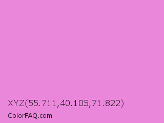 XYZ 55.711,40.105,71.822 Color is a light magenta color and the nearest color is Pale Magenta #f984e5. Hex code #eb87db and RGB value is rgb(235,135,219). In RGB color space, this color is composed of 92% red, 53% green, 86% blue, In CMYK color space, this color is composed of 0% cyan, 43% magenta, 7% yellow , 8% black , In HSL color space, this color has a hue angle of 310° , 71% saturation and 73% lightness.