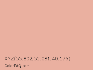 XYZ 55.802,51.081,40.176 Color is a light red color and the nearest color is Cashmere #e6bea5. Hex code #eab0a0 and RGB value is rgb(234,176,160). In RGB color space, this color is composed of 92% red, 69% green, 63% blue, In CMYK color space, this color is composed of 0% cyan, 25% magenta, 32% yellow , 8% black , In HSL color space, this color has a hue angle of 13° , 64% saturation and 77% lightness.