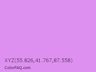 XYZ 55.826,41.767,87.558 Color is a light purple color and the nearest color is Bright Lilac #d891ef. Hex code #de90f0 and RGB value is rgb(222,144,240). In RGB color space, this color is composed of 87% red, 56% green, 94% blue, In CMYK color space, this color is composed of 8% cyan, 40% magenta, 0% yellow , 6% black , In HSL color space, this color has a hue angle of 289° , 76% saturation and 75% lightness.