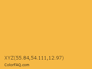 XYZ 55.84,54.111,12.97 Color is a light orange color and the nearest color is Maximum Yellow Red #f2ba49. Hex code #f5b844 and RGB value is rgb(245,184,68). In RGB color space, this color is composed of 96% red, 72% green, 27% blue, In CMYK color space, this color is composed of 0% cyan, 25% magenta, 72% yellow , 4% black , In HSL color space, this color has a hue angle of 39° , 90% saturation and 61% lightness.