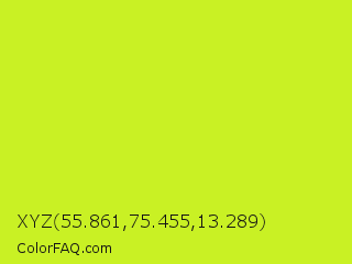 XYZ 55.861,75.455,13.289 Color is a normal lime color and the nearest color is Pear #d1e231. Hex code #c9f124 and RGB value is rgb(201,241,36). In RGB color space, this color is composed of 79% red, 95% green, 14% blue, In CMYK color space, this color is composed of 17% cyan, 0% magenta, 85% yellow , 5% black , In HSL color space, this color has a hue angle of 72° , 88% saturation and 54% lightness.