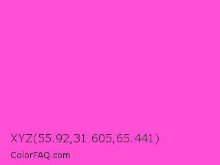 XYZ 55.92,31.605,65.441 Color is a light magenta color and the nearest color is Purple Pizzazz #fe4eda. Hex code #ff4fd4 and RGB value is rgb(255,79,212). In RGB color space, this color is composed of 100% red, 31% green, 83% blue, In CMYK color space, this color is composed of 0% cyan, 69% magenta, 17% yellow , 0% black , In HSL color space, this color has a hue angle of 315° , 100% saturation and 65% lightness.
