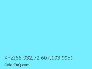 XYZ 55.932,72.607,103.995 Color is a light cyan color and the nearest color is Electric Blue #7df9ff. Hex code #75effd and RGB value is rgb(117,239,253). In RGB color space, this color is composed of 46% red, 94% green, 99% blue, In CMYK color space, this color is composed of 54% cyan, 6% magenta, 0% yellow , 1% black , In HSL color space, this color has a hue angle of 186° , 97% saturation and 73% lightness.