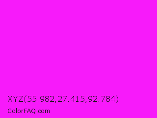 XYZ 55.982,27.415,92.784 Color is a normal magenta color and the nearest color is Magenta / Fuchsia #ff00ff. Hex code #f71afa and RGB value is rgb(247,26,250). In RGB color space, this color is composed of 97% red, 10% green, 98% blue, In CMYK color space, this color is composed of 1% cyan, 90% magenta, 0% yellow , 2% black , In HSL color space, this color has a hue angle of 299° , 96% saturation and 54% lightness.