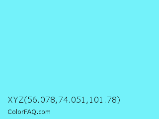 XYZ 56.078,74.051,101.78 Color is a light cyan color and the nearest color is Electric Blue #7df9ff. Hex code #73f2fa and RGB value is rgb(115,242,250). In RGB color space, this color is composed of 45% red, 95% green, 98% blue, In CMYK color space, this color is composed of 54% cyan, 3% magenta, 0% yellow , 2% black , In HSL color space, this color has a hue angle of 184° , 93% saturation and 72% lightness.