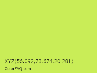 XYZ 56.092,73.674,20.281 Color is a light lime color and the nearest color is Maximum Green Yellow #d9e650. Hex code #c9ed57 and RGB value is rgb(201,237,87). In RGB color space, this color is composed of 79% red, 93% green, 34% blue, In CMYK color space, this color is composed of 15% cyan, 0% magenta, 63% yellow , 7% black , In HSL color space, this color has a hue angle of 74° , 81% saturation and 64% lightness.