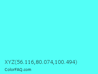 XYZ 56.116,80.074,100.494 Color is a light cyan color and the nearest color is Electric Blue #7df9ff. Hex code #53fff7 and RGB value is rgb(83,255,247). In RGB color space, this color is composed of 33% red, 100% green, 97% blue, In CMYK color space, this color is composed of 67% cyan, 0% magenta, 3% yellow , 0% black , In HSL color space, this color has a hue angle of 177° , 100% saturation and 66% lightness.