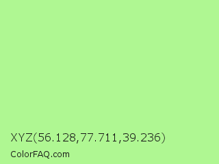 XYZ 56.128,77.711,39.236 Color is a light green color and the nearest color is Pale Green #98fb98. Hex code #aff792 and RGB value is rgb(175,247,146). In RGB color space, this color is composed of 69% red, 97% green, 57% blue, In CMYK color space, this color is composed of 29% cyan, 0% magenta, 41% yellow , 3% black , In HSL color space, this color has a hue angle of 103° , 86% saturation and 77% lightness.