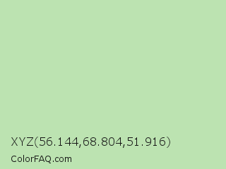 XYZ 56.144,68.804,51.916 Color is a light green color and the nearest color is Pixie Green #c0d8b6. Hex code #bce3b1 and RGB value is rgb(188,227,177). In RGB color space, this color is composed of 74% red, 89% green, 69% blue, In CMYK color space, this color is composed of 17% cyan, 0% magenta, 22% yellow , 11% black , In HSL color space, this color has a hue angle of 107° , 47% saturation and 79% lightness.