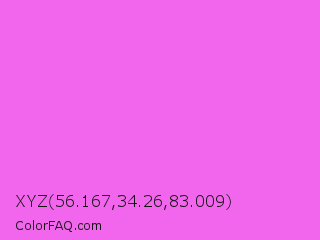XYZ 56.167,34.26,83.009 Color is a light magenta color and the nearest color is Pink Flamingo Crayola #ff66ff. Hex code #f166ec and RGB value is rgb(241,102,236). In RGB color space, this color is composed of 95% red, 40% green, 93% blue, In CMYK color space, this color is composed of 0% cyan, 58% magenta, 2% yellow , 5% black , In HSL color space, this color has a hue angle of 302° , 83% saturation and 67% lightness.