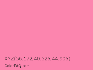 XYZ 56.172,40.526,44.906 Color is a light rose color and the nearest color is Tickle Me Pink #fc89ac. Hex code #fc85ae and RGB value is rgb(252,133,174). In RGB color space, this color is composed of 99% red, 52% green, 68% blue, In CMYK color space, this color is composed of 0% cyan, 47% magenta, 31% yellow , 1% black , In HSL color space, this color has a hue angle of 339° , 95% saturation and 75% lightness.