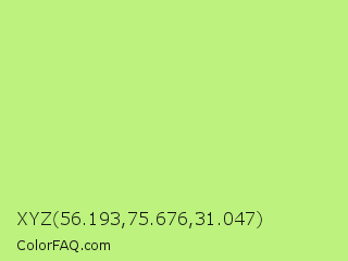 XYZ 56.193,75.676,31.047 Color is a light green color and the nearest color is Sulu #c1f07c. Hex code #bcf27d and RGB value is rgb(188,242,125). In RGB color space, this color is composed of 74% red, 95% green, 49% blue, In CMYK color space, this color is composed of 22% cyan, 0% magenta, 48% yellow , 5% black , In HSL color space, this color has a hue angle of 88° , 82% saturation and 72% lightness.