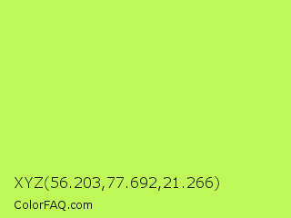 XYZ 56.203,77.692,21.266 Color is a light green color and the nearest color is Inchworm #b2ec5d. Hex code #bff658 and RGB value is rgb(191,246,88). In RGB color space, this color is composed of 75% red, 96% green, 35% blue, In CMYK color space, this color is composed of 22% cyan, 0% magenta, 64% yellow , 4% black , In HSL color space, this color has a hue angle of 81° , 90% saturation and 65% lightness.