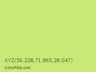 XYZ 56.228,71.865,28.047 Color is a light lime color and the nearest color is Yellow Green #c5e17a. Hex code #c8e976 and RGB value is rgb(200,233,118). In RGB color space, this color is composed of 78% red, 91% green, 46% blue, In CMYK color space, this color is composed of 14% cyan, 0% magenta, 49% yellow , 9% black , In HSL color space, this color has a hue angle of 77° , 72% saturation and 69% lightness.
