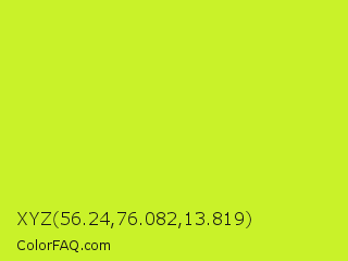 XYZ 56.24,76.082,13.819 Color is a normal lime color and the nearest color is Pear #d1e231. Hex code #c9f229 and RGB value is rgb(201,242,41). In RGB color space, this color is composed of 79% red, 95% green, 16% blue, In CMYK color space, this color is composed of 17% cyan, 0% magenta, 83% yellow , 5% black , In HSL color space, this color has a hue angle of 72° , 89% saturation and 55% lightness.