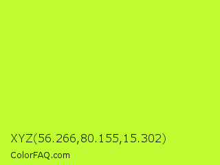 XYZ 56.266,80.155,15.302 Color is a normal lime color and the nearest color is Green Yellow #adff2f. Hex code #befb30 and RGB value is rgb(190,251,48). In RGB color space, this color is composed of 75% red, 98% green, 19% blue, In CMYK color space, this color is composed of 24% cyan, 0% magenta, 81% yellow , 2% black , In HSL color space, this color has a hue angle of 78° , 96% saturation and 59% lightness.