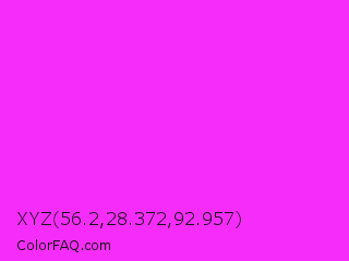 XYZ 56.2,28.372,92.957 Color is a normal magenta color and the nearest color is Magenta / Fuchsia #ff00ff. Hex code #f62dfa and RGB value is rgb(246,45,250). In RGB color space, this color is composed of 96% red, 18% green, 98% blue, In CMYK color space, this color is composed of 2% cyan, 82% magenta, 0% yellow , 2% black , In HSL color space, this color has a hue angle of 299° , 95% saturation and 58% lightness.
