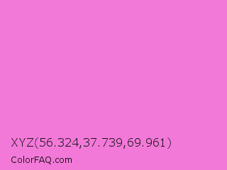 XYZ 56.324,37.739,69.961 Color is a light magenta color and the nearest color is Pale Magenta #f984e5. Hex code #f379d9 and RGB value is rgb(243,121,217). In RGB color space, this color is composed of 95% red, 47% green, 85% blue, In CMYK color space, this color is composed of 0% cyan, 50% magenta, 11% yellow , 5% black , In HSL color space, this color has a hue angle of 313° , 84% saturation and 71% lightness.