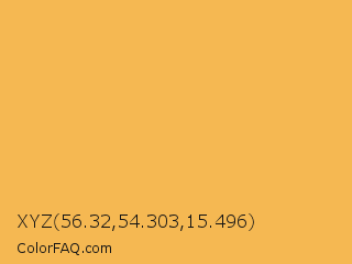 XYZ 56.32,54.303,15.496 Color is a light orange color and the nearest color is Casablanca #f8b853. Hex code #f5b852 and RGB value is rgb(245,184,82). In RGB color space, this color is composed of 96% red, 72% green, 32% blue, In CMYK color space, this color is composed of 0% cyan, 25% magenta, 67% yellow , 4% black , In HSL color space, this color has a hue angle of 38° , 89% saturation and 64% lightness.