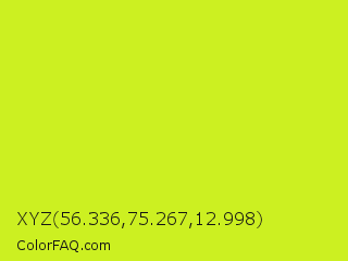 XYZ 56.336,75.267,12.998 Color is a normal yellow color and the nearest color is Arctic Lime #d0ff14. Hex code #ccf021 and RGB value is rgb(204,240,33). In RGB color space, this color is composed of 80% red, 94% green, 13% blue, In CMYK color space, this color is composed of 15% cyan, 0% magenta, 86% yellow , 6% black , In HSL color space, this color has a hue angle of 70° , 87% saturation and 54% lightness.