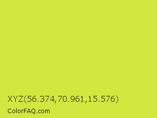 XYZ 56.374,70.961,15.576 Color is a normal yellow color and the nearest color is Pear #d1e231. Hex code #d4e640 and RGB value is rgb(212,230,64). In RGB color space, this color is composed of 83% red, 90% green, 25% blue, In CMYK color space, this color is composed of 8% cyan, 0% magenta, 72% yellow , 10% black , In HSL color space, this color has a hue angle of 67° , 77% saturation and 58% lightness.