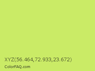 XYZ 56.464,72.933,23.672 Color is a light lime color and the nearest color is Booger Buster #dde26a. Hex code #caeb66 and RGB value is rgb(202,235,102). In RGB color space, this color is composed of 79% red, 92% green, 40% blue, In CMYK color space, this color is composed of 14% cyan, 0% magenta, 57% yellow , 8% black , In HSL color space, this color has a hue angle of 75° , 77% saturation and 66% lightness.