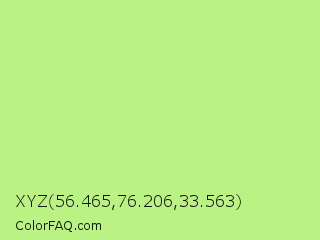 XYZ 56.465,76.206,33.563 Color is a light green color and the nearest color is Sulu #c1f07c. Hex code #baf384 and RGB value is rgb(186,243,132). In RGB color space, this color is composed of 73% red, 95% green, 52% blue, In CMYK color space, this color is composed of 23% cyan, 0% magenta, 46% yellow , 5% black , In HSL color space, this color has a hue angle of 91° , 82% saturation and 74% lightness.