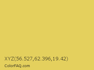 XYZ 56.527,62.396,19.42 Color is a light yellow color and the nearest color is Confetti #e9d75a. Hex code #e4d05d and RGB value is rgb(228,208,93). In RGB color space, this color is composed of 89% red, 82% green, 36% blue, In CMYK color space, this color is composed of 0% cyan, 9% magenta, 59% yellow , 11% black , In HSL color space, this color has a hue angle of 51° , 71% saturation and 63% lightness.