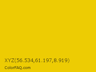 XYZ 56.534,61.197,8.919 Color is a normal yellow color and the nearest color is Yellow Munsell #efcc00. Hex code #edcc03 and RGB value is rgb(237,204,3). In RGB color space, this color is composed of 93% red, 80% green, 1% blue, In CMYK color space, this color is composed of 0% cyan, 14% magenta, 99% yellow , 7% black , In HSL color space, this color has a hue angle of 52° , 98% saturation and 47% lightness.