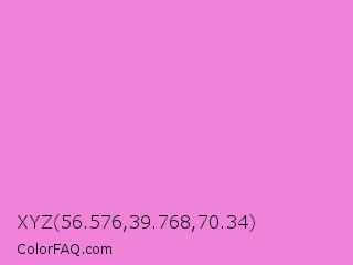 XYZ 56.576,39.768,70.34 Color is a light magenta color and the nearest color is Pale Magenta #f984e5. Hex code #f083d9 and RGB value is rgb(240,131,217). In RGB color space, this color is composed of 94% red, 51% green, 85% blue, In CMYK color space, this color is composed of 0% cyan, 45% magenta, 10% yellow , 6% black , In HSL color space, this color has a hue angle of 313° , 78% saturation and 73% lightness.