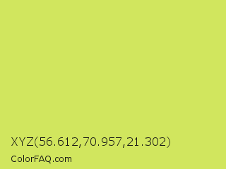 XYZ 56.612,70.957,21.302 Color is a light yellow color and the nearest color is Maximum Green Yellow #d9e650. Hex code #d1e65e and RGB value is rgb(209,230,94). In RGB color space, this color is composed of 82% red, 90% green, 37% blue, In CMYK color space, this color is composed of 9% cyan, 0% magenta, 59% yellow , 10% black , In HSL color space, this color has a hue angle of 69° , 73% saturation and 64% lightness.