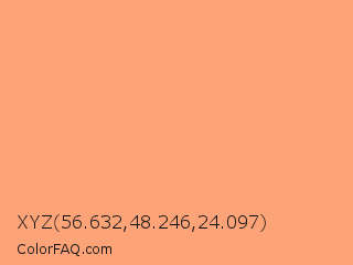 XYZ 56.632,48.246,24.097 Color is a light orange color and the nearest color is Light Salmon #ffa07a. Hex code #fca378 and RGB value is rgb(252,163,120). In RGB color space, this color is composed of 99% red, 64% green, 47% blue, In CMYK color space, this color is composed of 0% cyan, 35% magenta, 52% yellow , 1% black , In HSL color space, this color has a hue angle of 20° , 96% saturation and 73% lightness.