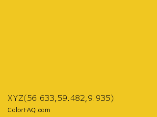 XYZ 56.633,59.482,9.935 Color is a normal yellow color and the nearest color is Deep Lemon #f5c71a. Hex code #f0c721 and RGB value is rgb(240,199,33). In RGB color space, this color is composed of 94% red, 78% green, 13% blue, In CMYK color space, this color is composed of 0% cyan, 17% magenta, 86% yellow , 6% black , In HSL color space, this color has a hue angle of 48° , 87% saturation and 54% lightness.