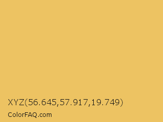 XYZ 56.645,57.917,19.749 Color is a light orange color and the nearest color is Cream Can #f5c85c. Hex code #edc362 and RGB value is rgb(237,195,98). In RGB color space, this color is composed of 93% red, 76% green, 38% blue, In CMYK color space, this color is composed of 0% cyan, 18% magenta, 59% yellow , 7% black , In HSL color space, this color has a hue angle of 42° , 79% saturation and 66% lightness.