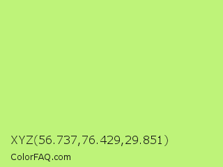 XYZ 56.737,76.429,29.851 Color is a light green color and the nearest color is Sulu #c1f07c. Hex code #bef379 and RGB value is rgb(190,243,121). In RGB color space, this color is composed of 75% red, 95% green, 47% blue, In CMYK color space, this color is composed of 22% cyan, 0% magenta, 50% yellow , 5% black , In HSL color space, this color has a hue angle of 86° , 84% saturation and 71% lightness.