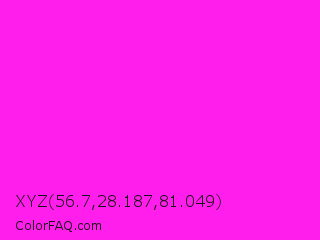 XYZ 56.7,28.187,81.049 Color is a normal magenta color and the nearest color is Hot Magenta #ff1dce. Hex code #ff1eeb and RGB value is rgb(255,30,235). In RGB color space, this color is composed of 100% red, 12% green, 92% blue, In CMYK color space, this color is composed of 0% cyan, 88% magenta, 8% yellow , 0% black , In HSL color space, this color has a hue angle of 305° , 100% saturation and 56% lightness.