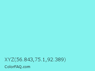 XYZ 56.843,75.1,92.389 Color is a light cyan color and the nearest color is Electric Blue #7df9ff. Hex code #83f3ee and RGB value is rgb(131,243,238). In RGB color space, this color is composed of 51% red, 95% green, 93% blue, In CMYK color space, this color is composed of 46% cyan, 0% magenta, 2% yellow , 5% black , In HSL color space, this color has a hue angle of 177° , 82% saturation and 73% lightness.