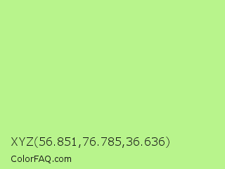 XYZ 56.851,76.785,36.636 Color is a light green color and the nearest color is Sulu #c1f07c. Hex code #b8f48c and RGB value is rgb(184,244,140). In RGB color space, this color is composed of 72% red, 96% green, 55% blue, In CMYK color space, this color is composed of 25% cyan, 0% magenta, 43% yellow , 4% black , In HSL color space, this color has a hue angle of 95° , 83% saturation and 75% lightness.